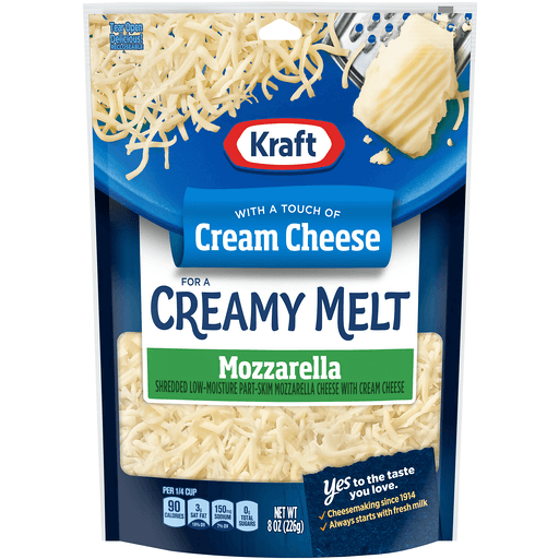 Mealtime can be hard, especially when it comes to making something everyone agrees on. Use Kraft Creamy Melt Shredded Mozzarella Cheese With a Touch of Cream Cheese to make something everyone will love, so you can spend time focused on each other and not worried about making everyone happy. This mozzarella cheese melts perfectly over your favorite pastas, casseroles, sides, or anything else that's made better by cheese (AKA everything!) for the creamy, melty goodness your family loves. Cream cheese adds the extra touch of creaminess to make all your recipes extraordinary. This shredded cheese sprinkles evenly and melts easily over any dish. Guaranteed to make your next pasta or pizza dish a family favorite. Each 8 ounce bag of cheese is resealable to help lock in flavor.