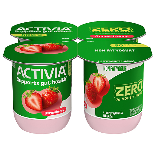 Start your day with your gut health in mind with Activia ZERO 0g Added Sugar* Strawberry Probiotic Nonfat Yogurt. Backed by 20 years of gut health research, this delicious strawberry yogurt contains billions of probiotics and 0 grams of added sugar.* Probiotics are living microorganisms that provide specific health benefits, including supporting gut health.*** Each strawberry yogurt cup has 0 grams of fat, and 50 calories per serving. Enjoy these 0g added sugar* yogurt cups as part of your breakfast, grab and go snacks, or as an addition to your yogurt smoothie. ***Enjoying Activia twice a day for two weeks as part of a balanced diet and healthy lifestyle may help reduce the frequency of minor digestive discomfort, which includes gas, bloating, rumbling, and abdominal discomfort.