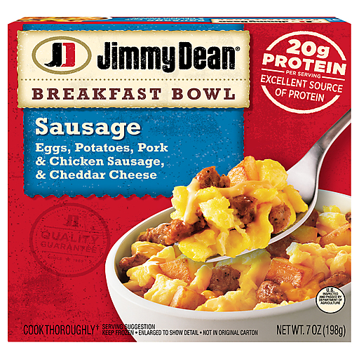 Filled with sausage crumbles, eggs, potatoes, and cheddar cheese, Jimmy Dean Sausage, Egg & Cheese Breakfast Bowls are sure to be the best part of the morning. Each microwavable bowl contains 20 grams of protein per serving. Simple to prepare and ready in minutes, this frozen breakfast bowl is made with premium ingredients and the Jimmy Dean brand quality known and trusted.
