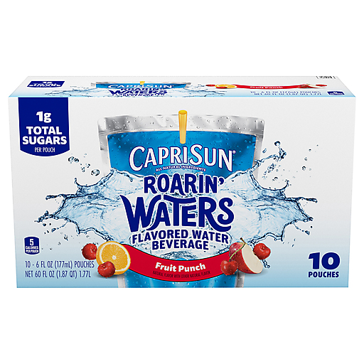 Splash into hydration! Capri Sun Roarin’ Waters Fruit Punch Flavored Water Beverage makes it easy to help kids stay hydrated. Our formula is sweetened with stevia and sugar. Fruit Punch features the lush flavor of sweet apples, zesty oranges and tart cherries. Always a kid's favorite, our flavored water is so tasty even parents can't resist sneaking a pouch or two! Capri Sun Roarin’ Waters Fruit Punch Flavored Water Beverage comes in the iconic Capri Sun 6 fluid ounce pouch so it’s easy to help kids stay hydrated at school, on the playground or during practice. Each box contains 10 convenient pouches of fruity flavored water.