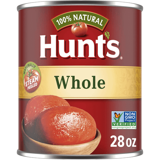 Get cooking with Hunt's Peeled Whole Tomatoes. These whole tomatoes are packed in their own juice to add great tomato taste to soups, stews, spaghetti sauce, casseroles, and chili. A crowd-pleaser and pantry staple, these whole peeled tomatoes save you the hassle of peeling tomatoes and are a flavorful addition to any recipe. Hunt's tomatoes are the trusted start to easy and delicious meals. These 100% natural canned whole tomatoes are Non-GMO Project Verified and contain no artificial preservatives or ingredients, so you can trust they are an ideal way to elevate meals for your family. Try these whole canned tomatoes in chili, tomato soup or in homemade pasta sauce. Ready when you need them, juicy canned tomatoes are a household staple. Keep them on hand for canned goods with delicious flavor. Great meals start with Hunt’s.