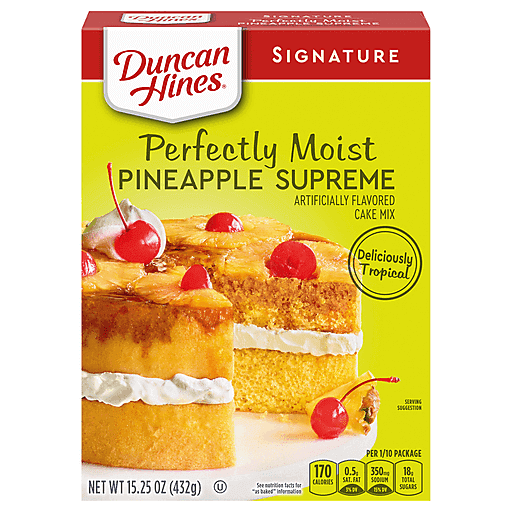 Duncan Hines Signature Perfectly Moist Pineapple Supreme Naturally Flavored Cake Mix makes a moist and delicious pineapple cake that is sure to become a family favorite. The smooth and velvety cake batter makes it easy to bake a perfectly moist cake every time. Simply add water, eggs and vegetable oil to the baking mix and stir to combine. Pour into a pan and bake for the recommended time in the instructions. Prepare this pineapple cake mix to make a decadent layer cake with frosting or add pineapple slices and cherries for pineapple upside down cake. You can also use it as a cupcake mix, or to make fun cake creations like cake pops. This certified Kosher boxed cake mix makes one 8 or 9 inch layer cake, one 13 x 9 inch sheet cake or 24 cupcakes. From birthday cake to single serve desserts, Duncan Hines has you covered when you're ready to bake and create. Bake someone happy!