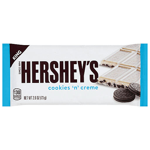 Looking for a twist on a classic candy bar? Look no further! HERSHEY'S Cookies 'n' Creme candy bars make life more delicious! Stock your pantry with king size bars or opt to share a bar with friends, family and everyone you love. These king size, kosher certified, individually wrapped candy bars offer a twist on the classic HERSHEY'S bar, and are the perfect treat for countless special and everyday occasions. Enjoy a smooth white creme base combined with crunchy chocolate cookie pieces. It's a sweet treat that offers delicious indulgence in every bite. Keep some on hand for guests and store a few in your pantry for convenient snacking when the mood strikes. Show up to movie night with HERSHEY'S Cookies 'n' Creme king size candy bars to share with attendees and please the whole crowd. You can also pop pieces of these candy bars into a bucket of popcorn for a sweet and salty combo. Or sweeten up your favorite homemade recipes by using these candy bars on top of freshly baked cakes, cookies and cupcakes. We're getting hungry just thinking about it! Everyone is excited when they're reaching for HERSHEY'S Cookies 'n' Creme candy bars, and now you can be, too!