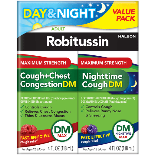 Robitussin Maximum Strength Cough + Chest Congestion DM (in each 20 mL) Other Information: Each 20 ml contains: Sodium 12 mg. Store at 20-25 degrees C (68-77 degrees F). Do not refrigerate. Robitussin Maximum Strength Nighttime Cough DM (in each 20 mL) Other Information: Each 20 ml contains: Sodium 14 mg. Store at 20-25 degrees C (68-77 degrees F). For ages 12 & over. Should be 18 or older to purchase. Cough + Chest Congestion DM: Dextromethorphan HBr (Cough suppressant). Guaifenesin (Expectorant). Controls cough. Relieves chest congestion. Thins & loosens mucus. Non-drowsy. DM max. Fast effective cough relief. Nighttime Cough DM: Dextromethorphan HBr (Cough suppressant). Doxylamine Succinate (Antihistamine). Controls cough. Relieves runny nose & sneezing. DM max. Fast effective cough relief. Maximum strength claim based on maximum levels of active ingredients per dose. Strong soothing action and fast, powerful cough relief. www.robitussin.com. For most recent production information, visit www.robitussin.com. Questions or comments? Call weekdays from 9 am to 5 pm est at 1-800-762-4675. Parents: Learn about teen medicine abuse. www.StopMedicineAbuse.org. Also Available: Severe multi-symptom cough cold + flu nighttime. Severe multi-symptom cough cold + flu. 12 hour cough relief.