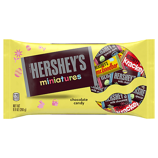 When the Easter bunny comes to town, you know what treat to reach for! There's something for everyone in this HERSHEY'S Miniatures chocolate candy assortment. Find miniature versions of all your favorite HERSHEY'S chocolate candy bars in one sweet bag, including HERSHEY'S milk chocolate candy bars, HERSHEY'S SPECIAL DARK mildly sweet chocolate candy bars, HERSHEY'S KRACKEL chocolate candy with crisped rice bars and HERSHEY'S MR. GOODBAR chocolate candy with peanuts bars. Enjoy delicious candy classics individually wrapped in festive Easter themed wrappers for lasting freshness and convenience all season long. HERSHEY'S Miniatures assorted chocolate candies are perfect for all your spring activities like family gatherings, hiking and movie nights. These assorted chocolate candy miniatures will keep your snacking fun and simple this spring. Give a variety of classic and well-loved chocolate candies to your favorite people, whether you're looking to share with family, friends or co-workers. Want to take these treats a step further? Place HERSHEY'S Miniatures chocolate candy bars on top of your best baked goods like bunny bark, brownies, cupcakes and cookies to get everyone in the spirit of love and please the crowd with your culinary genius! Just don't forget to save a few candy bars for yourself during all of that sharing.