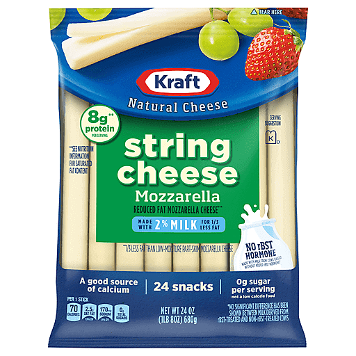 Kraft Natural Mozzarella String Cheese Sticks are a convenient snack to satisfy the cheese lovers in your family. Perfectly portioned, these low-moisture and part-skim mozzarella sticks are an easy way to add protein and calcium to your family's diet, see nutrition information for saturated fat content. Kraft mozzarella cheese is crafted from fresh pasteurized milk for quality and flavor, and each string cheese stick has 7 grams of protein. Keep a pack of Kraft String Cheese in the fridge for an easy after school snack, or pop a mozzarella cheese stick in your lunch box for a delicious side. This 24 ounce pack includes 24 cheese sticks individually wrapped to help lock in flavor and for easy on-the-go use.