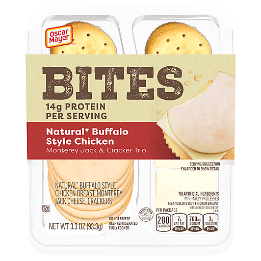 Elevate snack time with our thoughtfully crafted meat and cheese plate. Oscar Mayer Bites is a quick and delicious on-the-go snack. Slices of natural Buffalo-style chicken, Monterey Jack cheese and butter crackers are a great part of a workplace lunch. Packed with 14 grams of protein to fuel your day, our snack kit is designed to deliver the perfect balance of flavor and convenience for your busy lifestyle. Our high-quality Oscar Mayer Natural deli meats contain no artificial ingredients. Our individually packaged snack provides a satiating midday boost when work keeps you busy. Keep our 3.3-ounce meat and cheese plate refrigerated at all times for ready-to-eat deliciousness straight from the fridge.