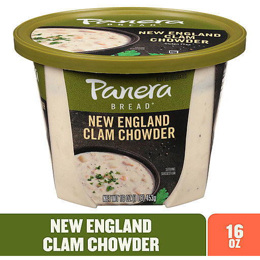 Panera New England Clam Chowder delivers a rich soup in a microwavable cup for easy preparation at home or on the go. Delicious alone or as a base for flavorful recipes, this Panera soup combines chopped sea clams, diced potato, onion and traditional seasonings simmered in a creamy broth. Enjoy a warm cup of soup at home when you don't feel like cooking, or use this clam chowder as a tasty, quick meal on your busy days. Remove the lid and film from this microwave soup cup and heat it on high in the microwave for three to four minutes. You can also cook this soup on the stovetop to 165 degrees F, but don't let it boil. Keep this packaged soup refrigerated or frozen to preserve its freshness. Make easy, craveable meals with help from Panera Bread at home.