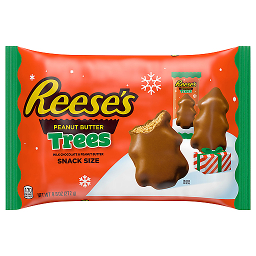 The holidays just got a lot sweeter with REESE'S Milk Chocolate Snack Size Peanut Butter Trees candy. Whether you're filling Christmas candy dishes or stuffing a line of festive stockings, there's never been a better season to get lost in the taste of smooth peanut butter and rich milk chocolate of a REESE'S candy. 'Tis a time for spreading joy, and each tree shaped chocolate sweet in this bag provides a perfect helping of festive fun to treat the taste buds of your favorite candy lover on Christmas. Light in weight but heavy on flavor, these candy trees are sure to please anyone in need of a chocolate pick-me-up. Remember to treat yourself too. Keep some REESE'S peanut butter trees candies on hand for your next Christmas movie marathon. And don't stop there! If you're feeling creative this holiday season, include REESE'S milk chocolate peanut butter treats in your baking plans. Try putting whole or crumbled chocolate peanut butter candy on top of your best cookies, cupcakes or brownies — anyone you share with will beg for your secret recipe after just one bite. Just don't forget to save a few peanut butter Christmas candies for yourself during all of that sharing!